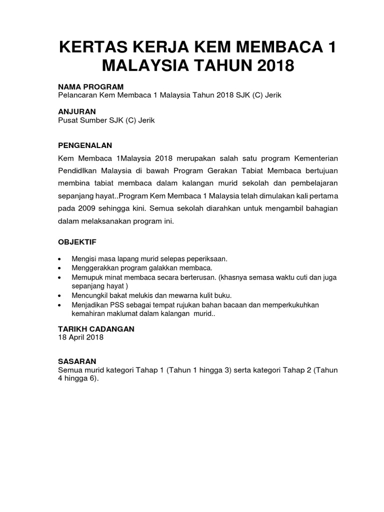 Kertas Kerja Kem Membaca 1 Malaysia Tahun 2018 Pdf